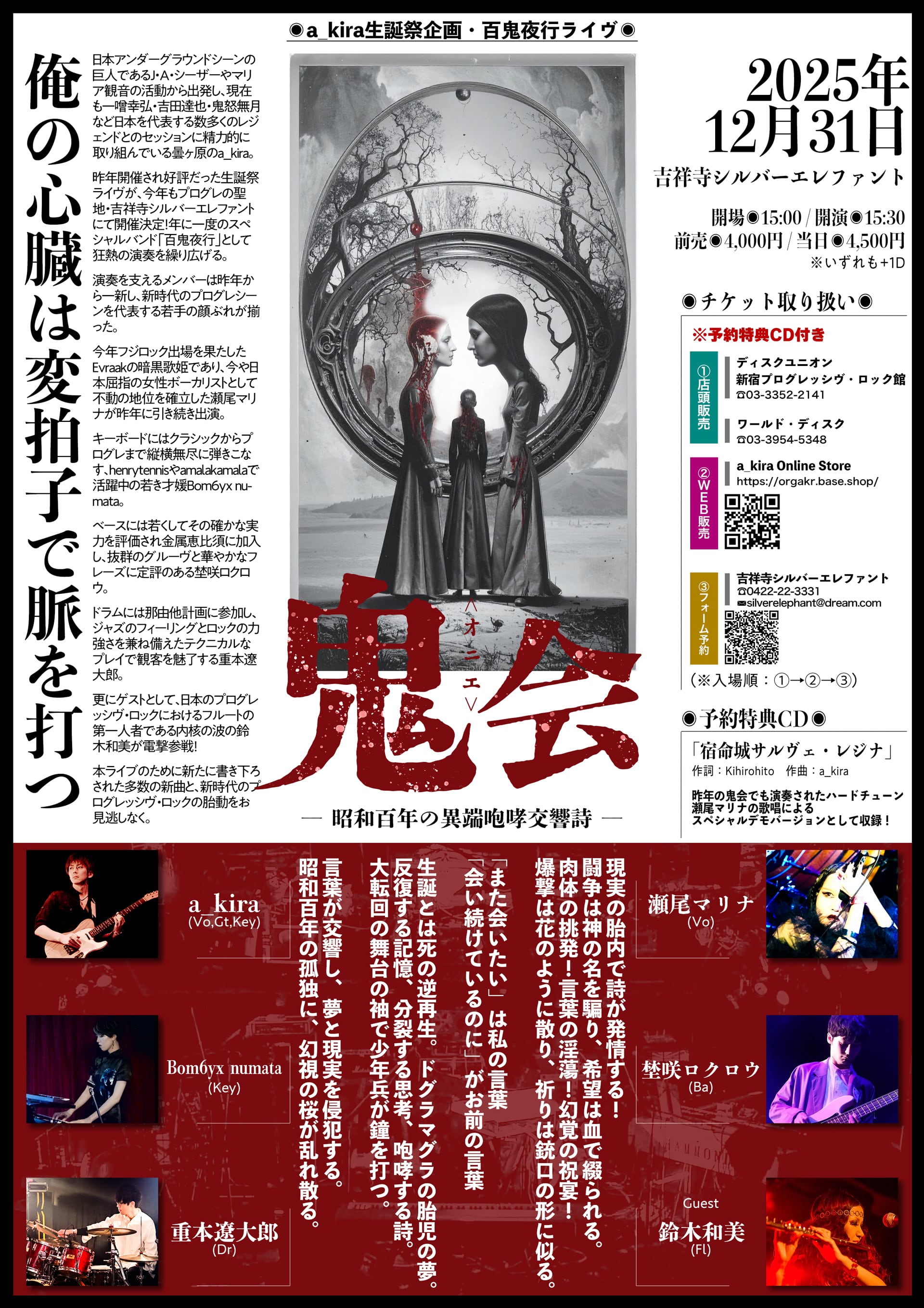 昨年開催され好評だった生誕祭ライヴが、今年もプログレの聖地・吉祥寺シルバーエレファントにて開催決定!年に一度のスペシャルバンド「百鬼夜行」として狂熱の演奏を繰り広げる。